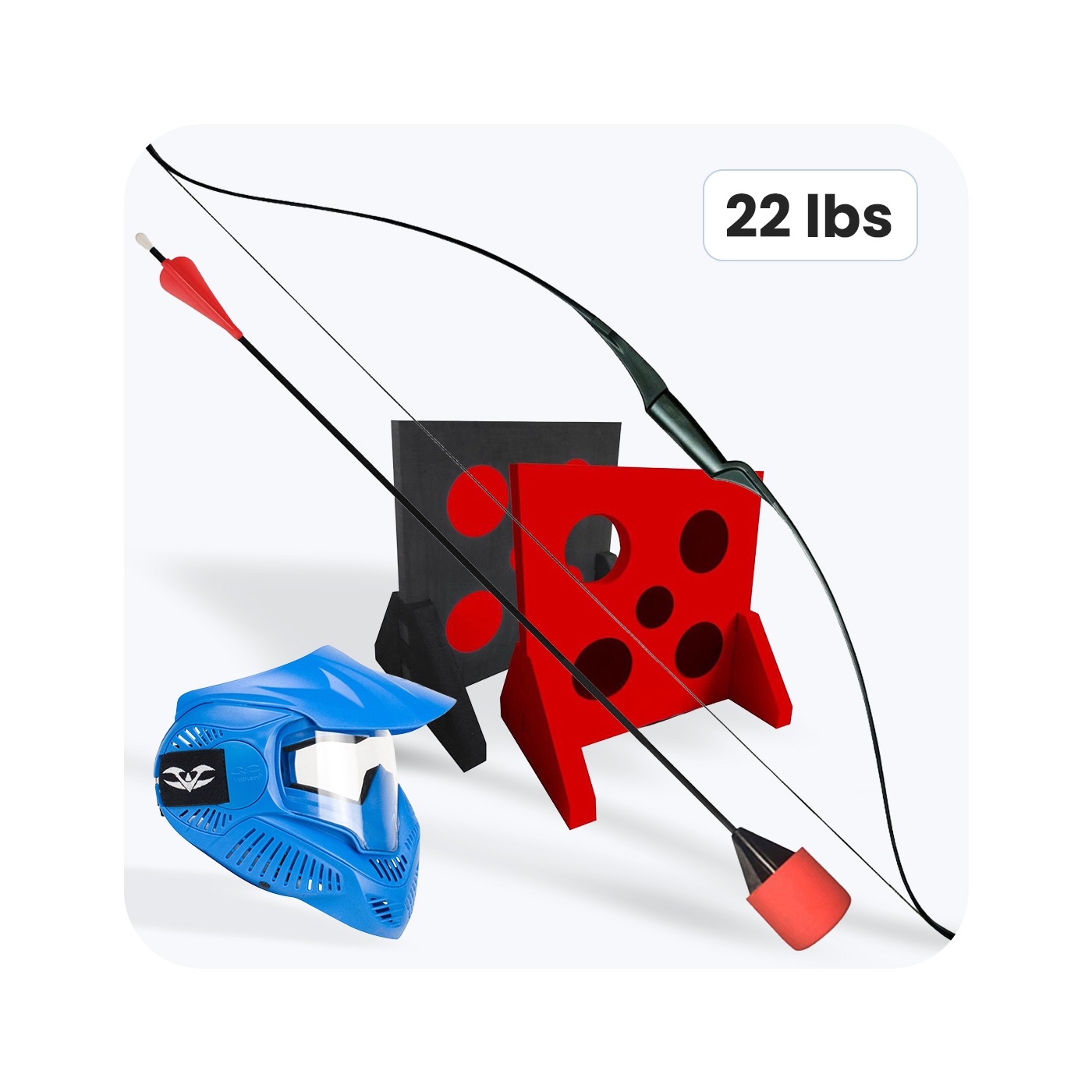 The 22 lbs bows are suitable for beginners and more experienced players, offering precision and smoothness. Foam tip arrows with a light design and padded ends allow fast, controlled matches.