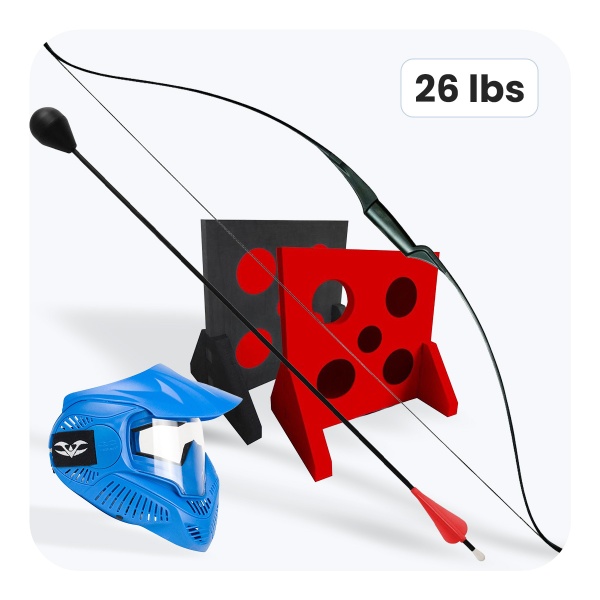 The 26 lbs bows deliver intense excitement and greater precision, appreciated by advanced players. Speed arrows with a light, aerodynamic design reduce the risk of injury, ensuring safe fun even with high player rotation.