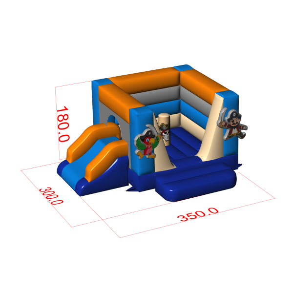Like all our inflatable attractions, this product is made from high-quality materials—in this case, next-generation PVC with high tear resistance. Small bouncy castle with slide - in a pirate theme measures 3 m x 3.5 m x 1.8 m (length, width, and height). It complies with the PN-EN 14960 safety standard for inflatable play equipment. We recommend using blowers with this inflatable, which are included in the set. Like most of our attractions, this inflatable comes with a two-year warranty. At Gangaru (formerly GunGan), we make things easy for you—each inflatable includes a complete set of accessories for anchoring (ropes, pegs). The attraction has also been safety-inspected by an independent expert.