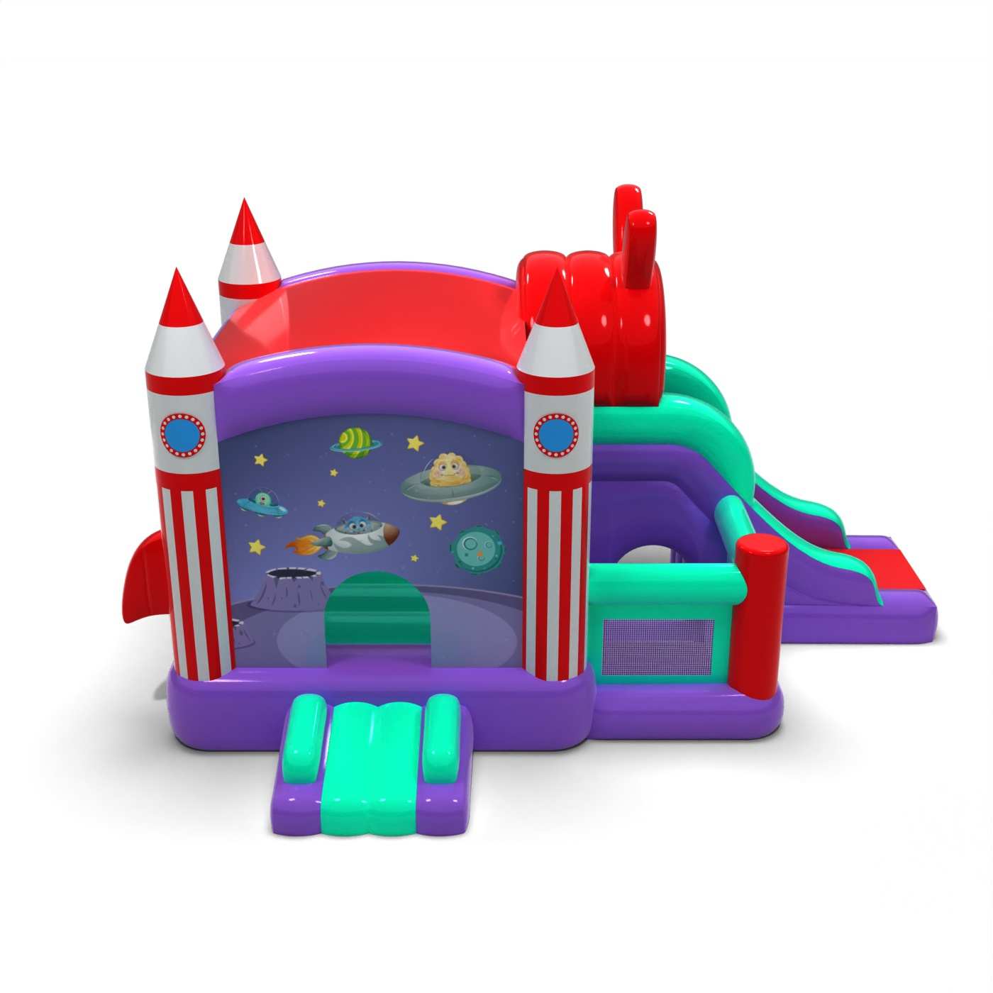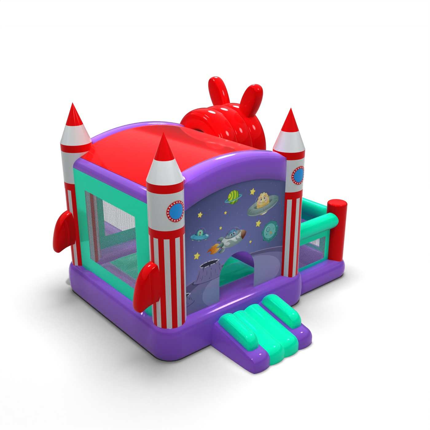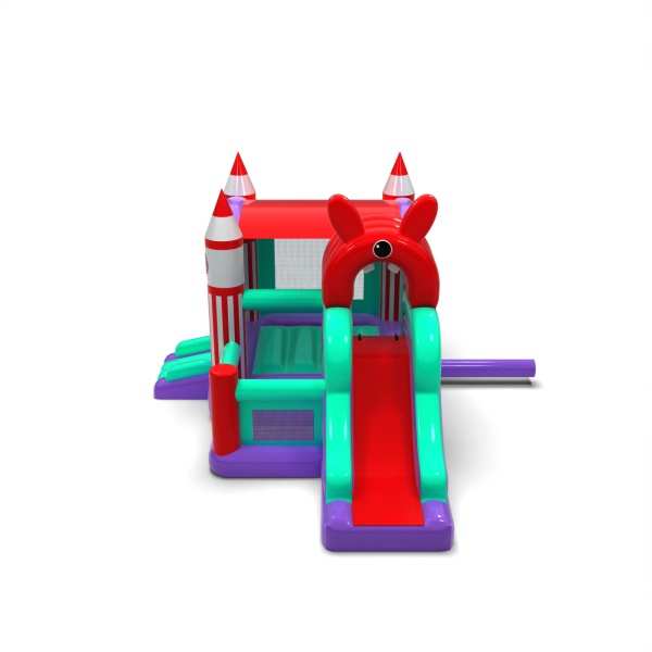 The distinctive body and futuristic design make the attraction stand out well in the event space. The integrated jump and slide zone provides a dynamic and engaging form of play for children. Cosmic visual details enhance the sense of adventure and discovery of new worlds. It is a solid choice for organisers looking for an inflatable with a versatile yet distinctive atmosphere. The model will work well for larger festivals, family picnics and themed events.