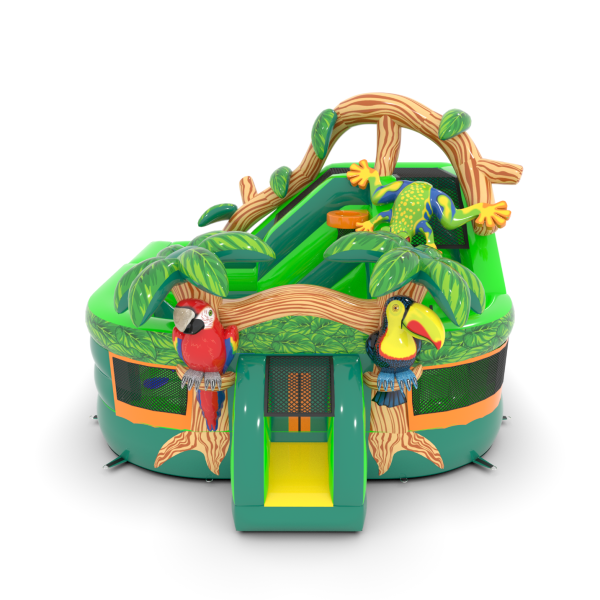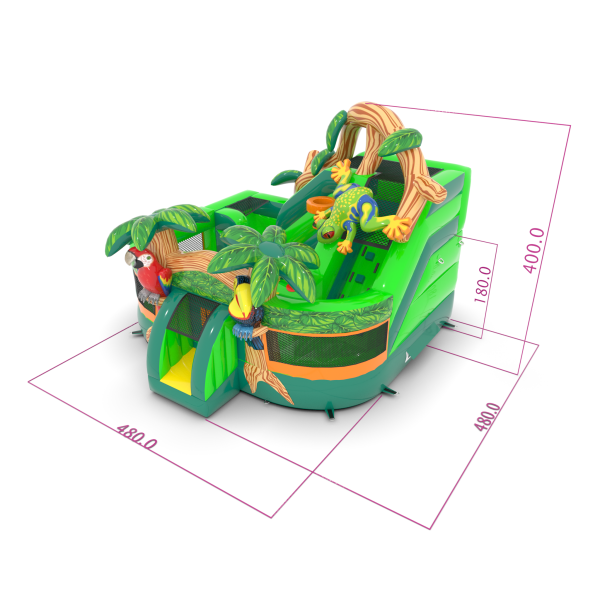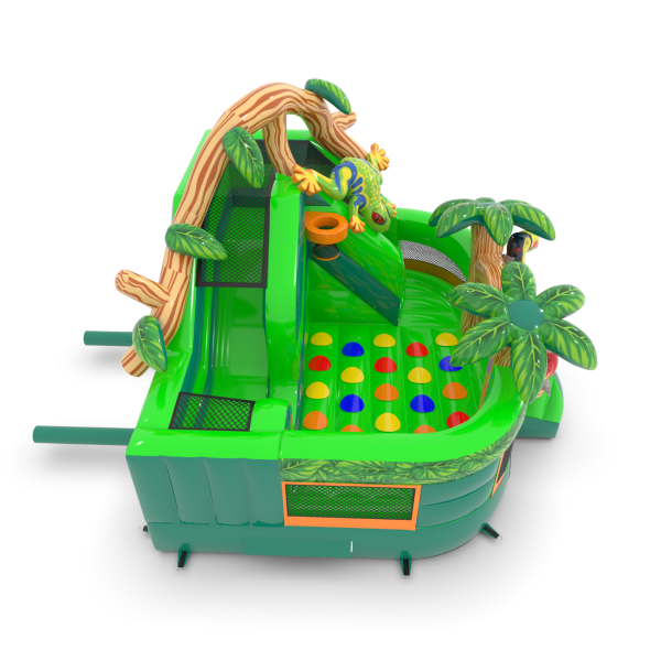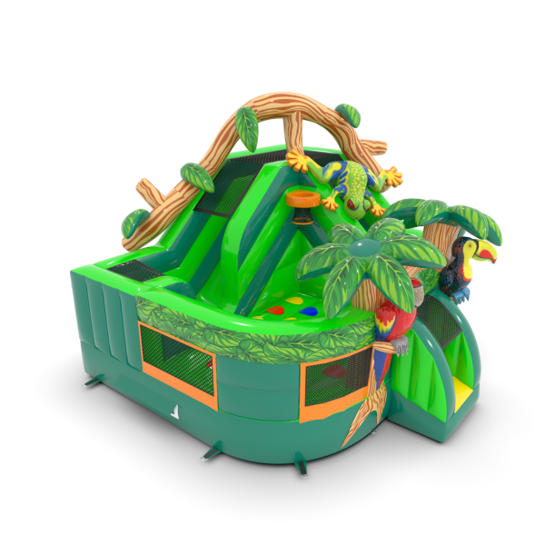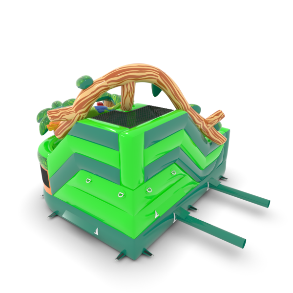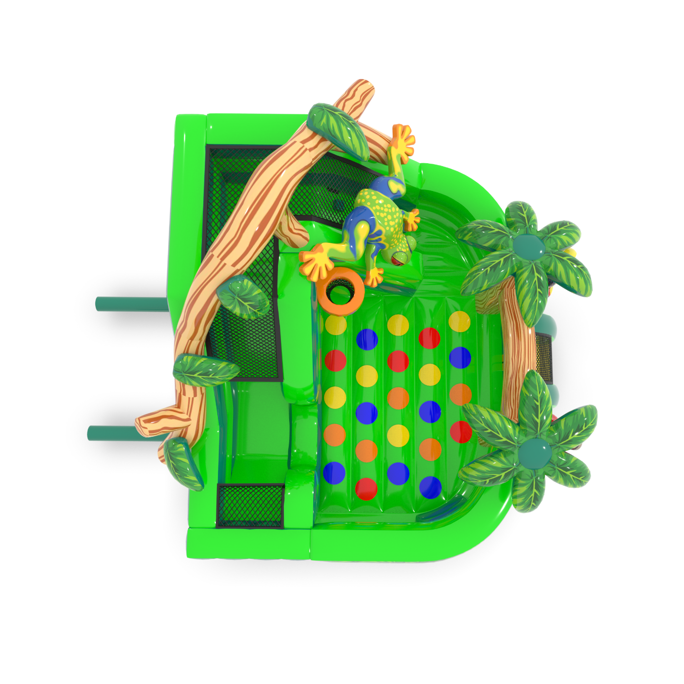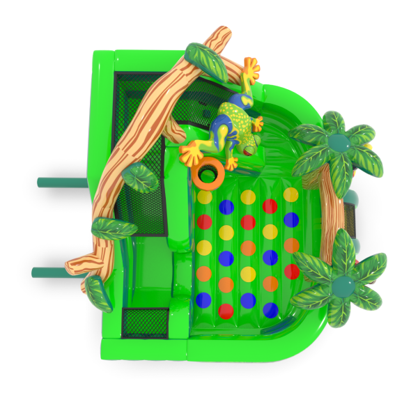 Inflatable playground "frog" in jungle theme is primarily designed for children looking for adventure while playing with friends and peers. The inflatable playground is enclosed and cushioned, making it completely safe to use. It usually features both a large and a small slide, ensuring great fun for kids of various ages. Inflatable playground "frog" in jungle theme is an excellent choice for family picnics, corporate and team-building events, or any other type of gathering — both outdoors and indoors. Inflatable playgrounds are a great alternative to larger, more demanding inflatables. We especially recommend this attraction for those just starting a rental or events business.