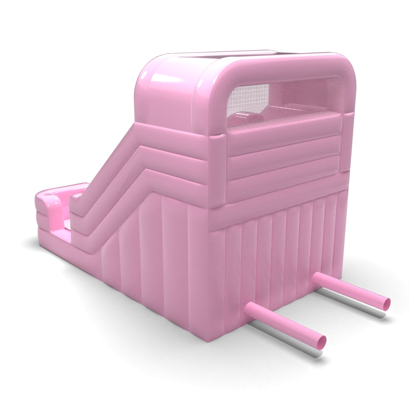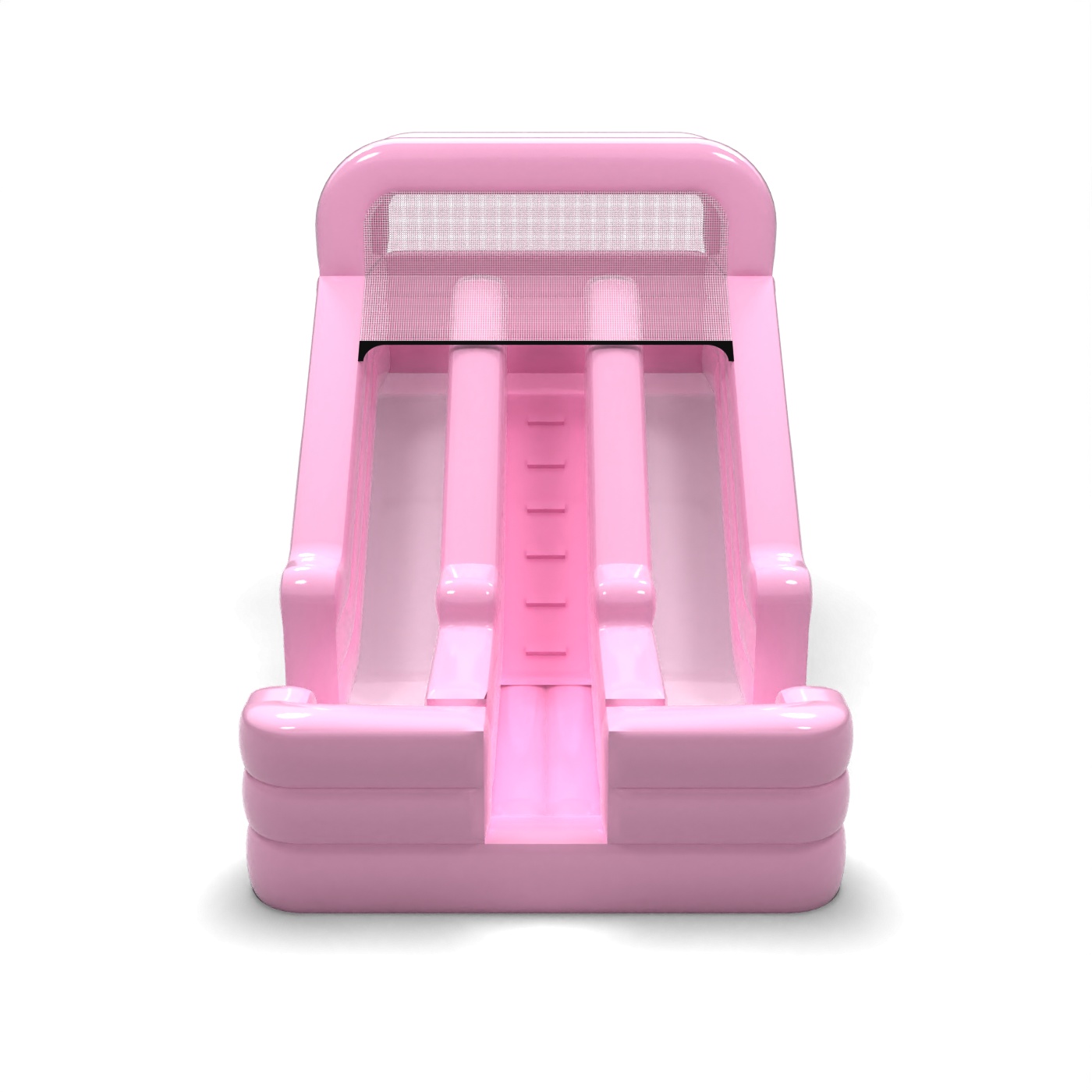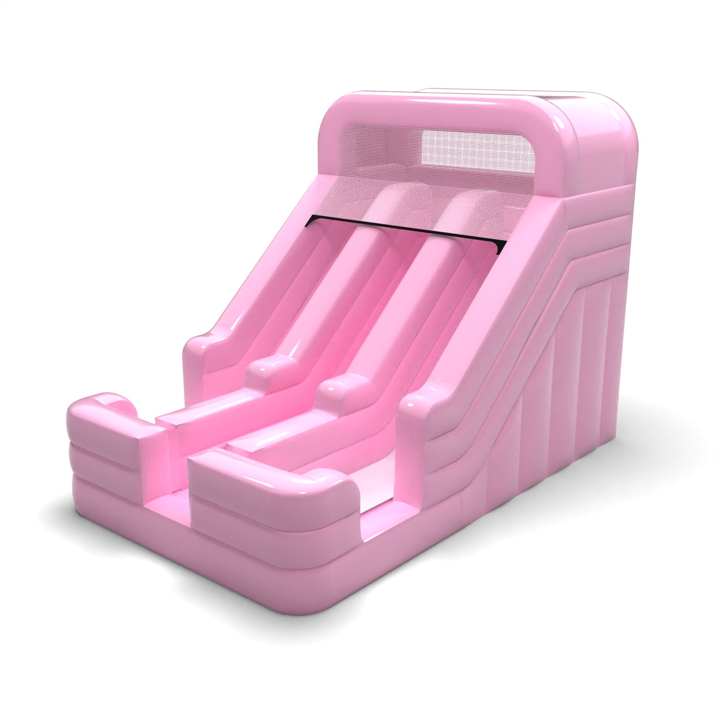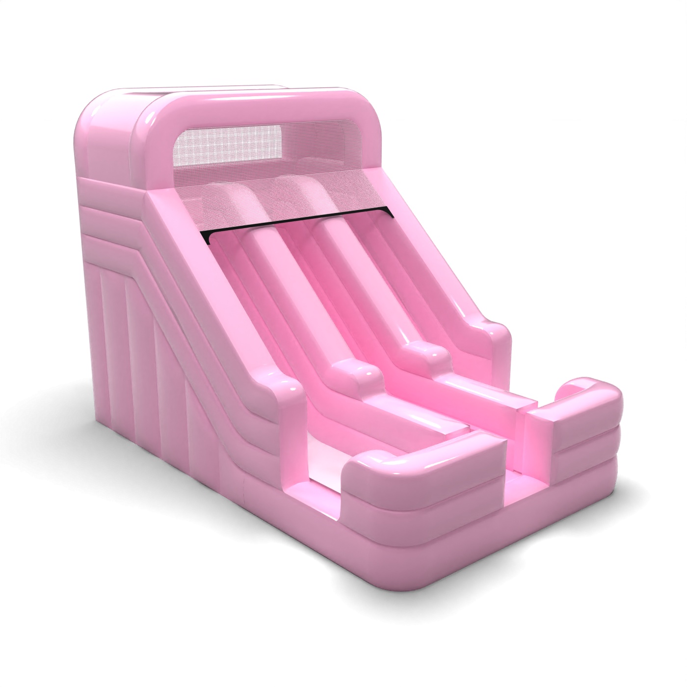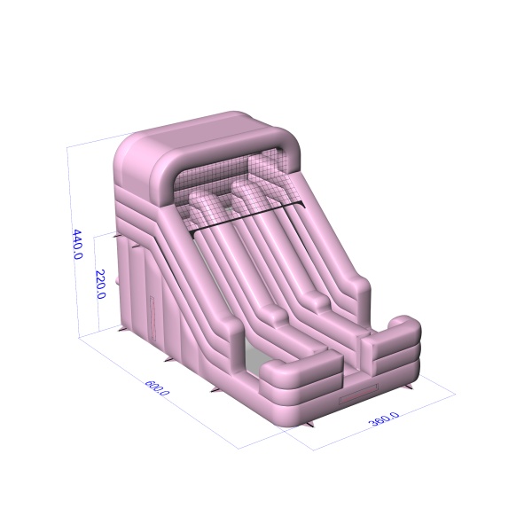 Powder pink gives this two-track slide a light, harmonious look that fits in well with quiet family settings. The two independent tracks allow for parallel play, making it easy to handle a larger group of children in a short space of time. The simple, symmetrical form makes the structure visually clear and easy to position in the designated animation zone. It is a model that is particularly attractive for rental companies catering for garden parties, pre-school events and intimate outdoor productions. The slide will find its place best where subtle colours, good organisation of movement and aesthetic coherence of the event are important.