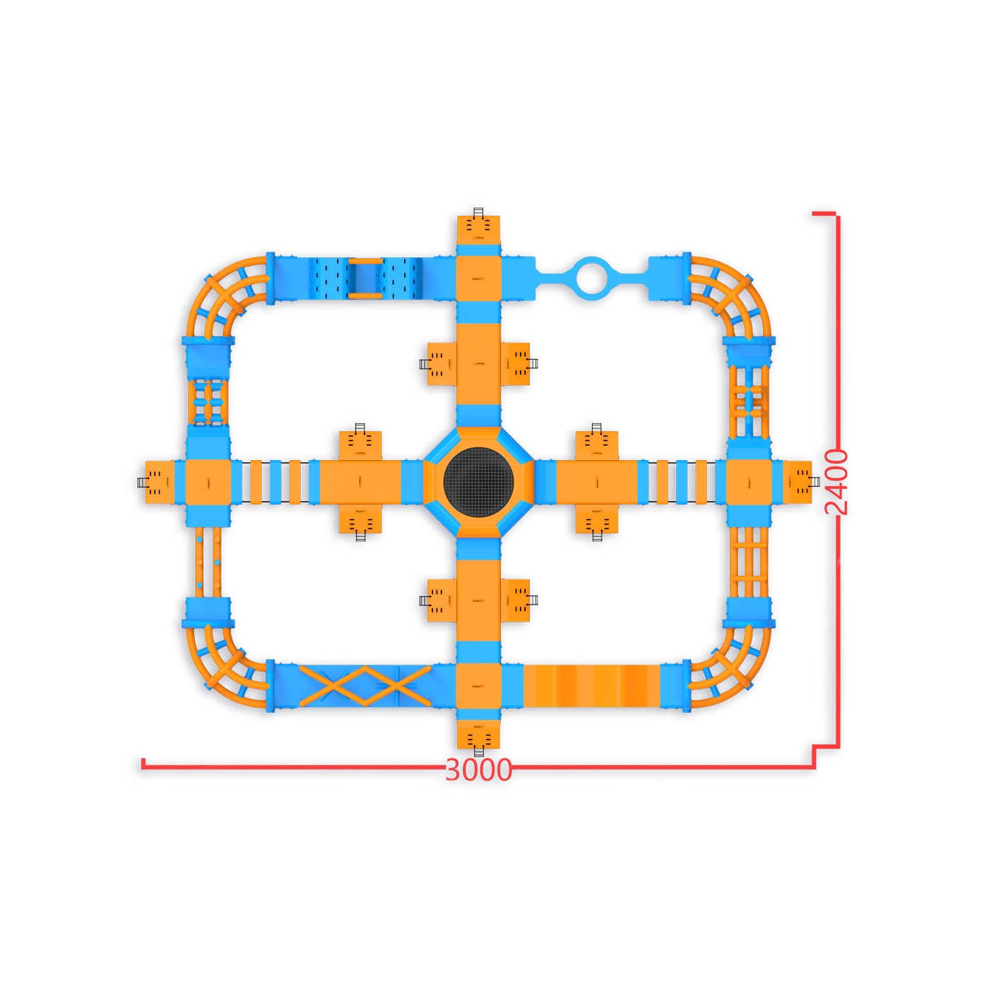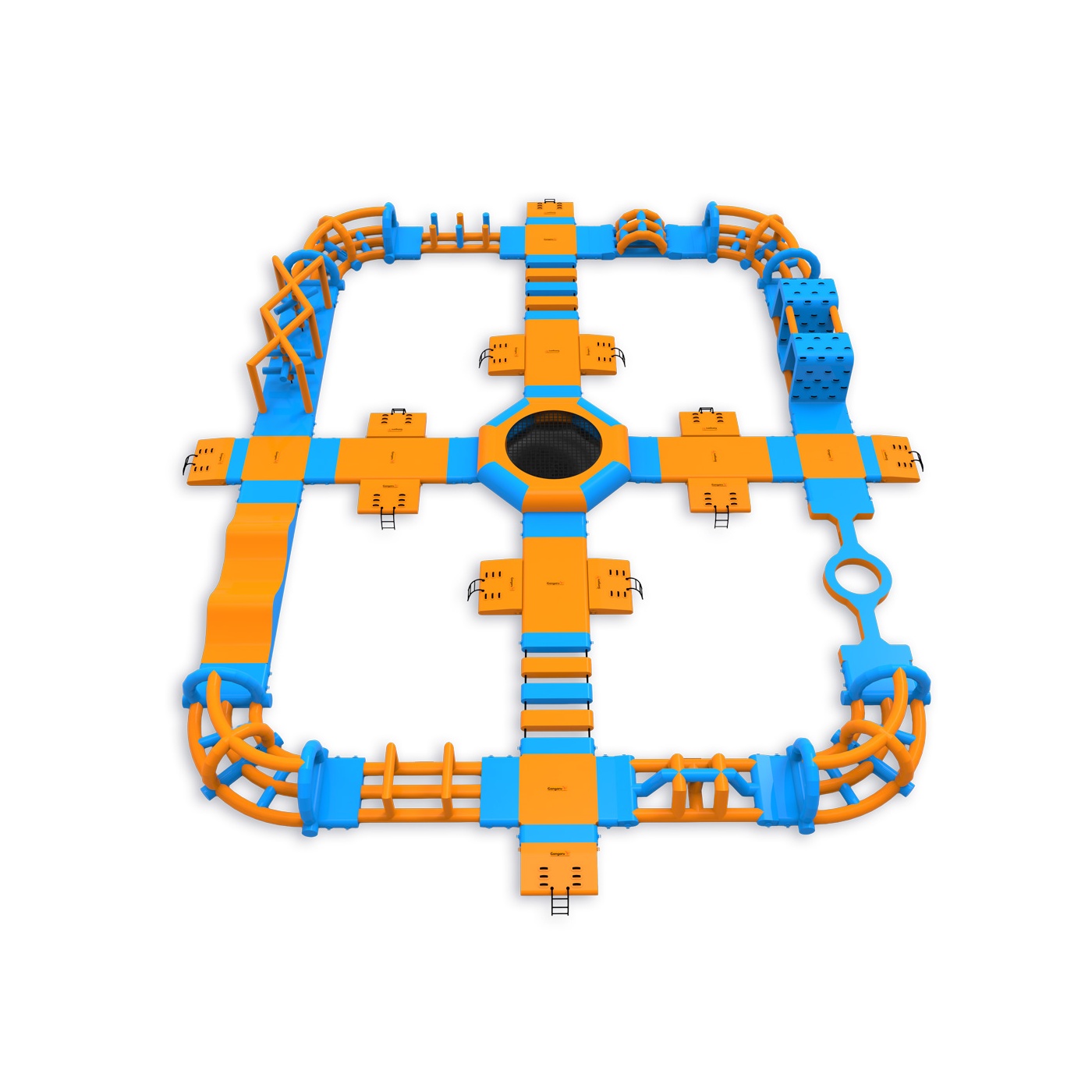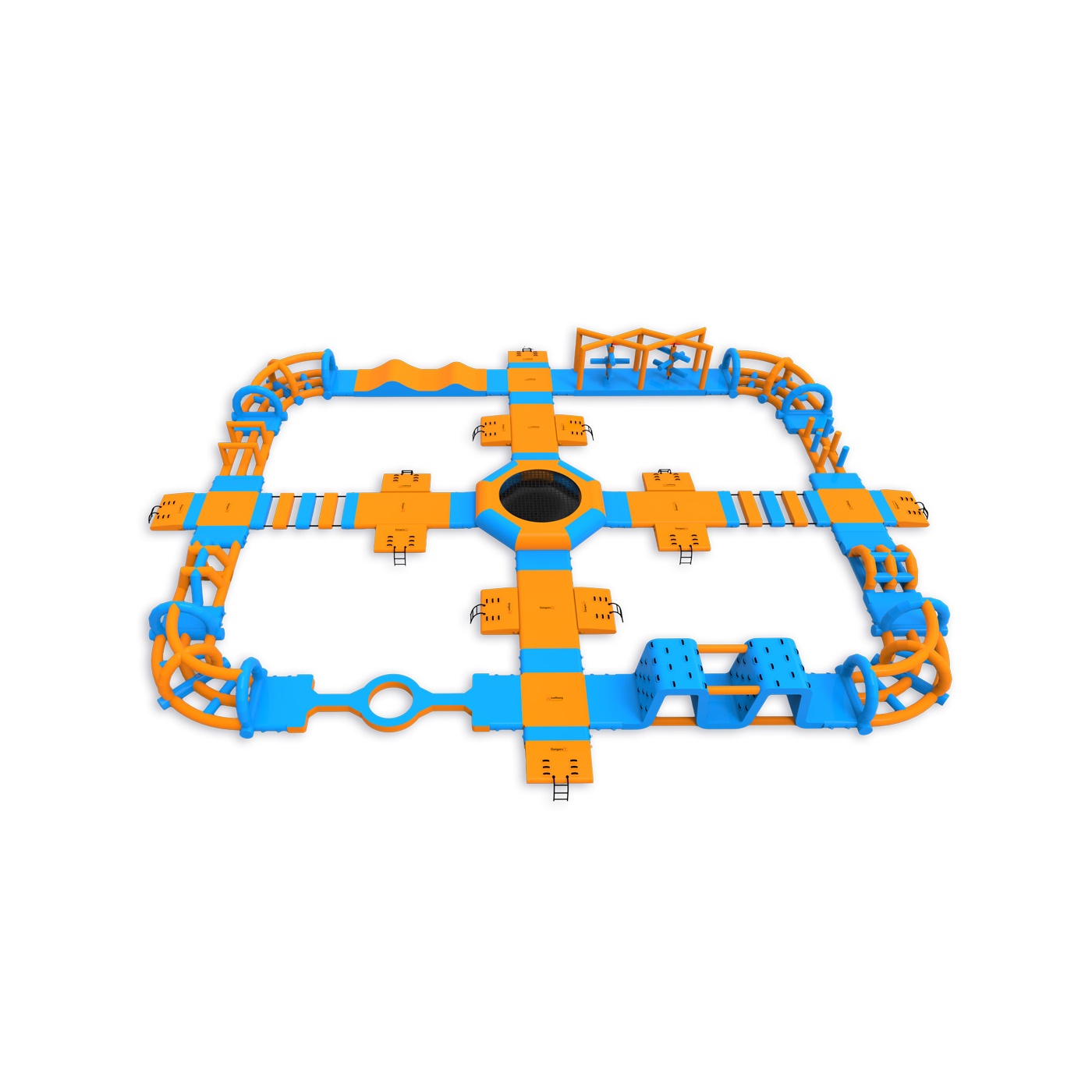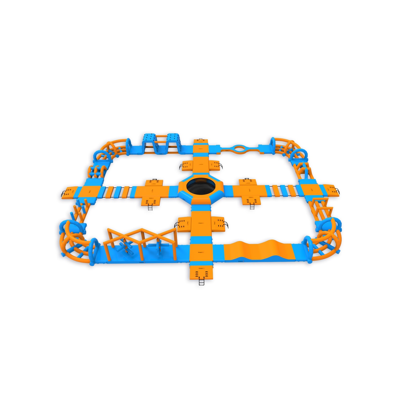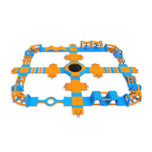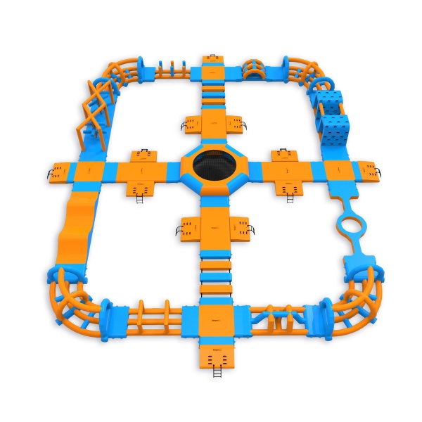A trampoline at the heart of the park - an element that attracts participants and organises movement around the entire layout. A perimeter obstacle course with platforms, climbing elements, bridges and hills provides continuous activity for groups of up to 76 people at a time. It works well on medium-sized bodies of water where high turnover and full use of the season is important.