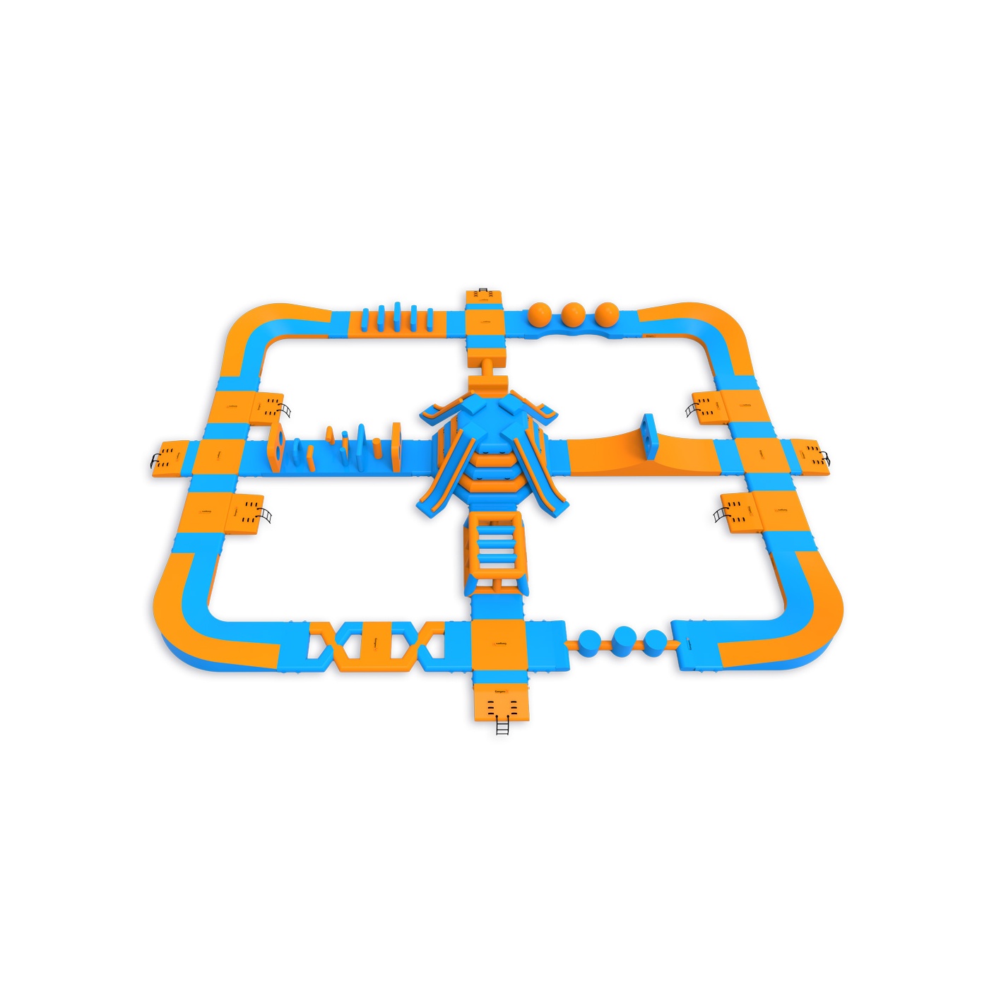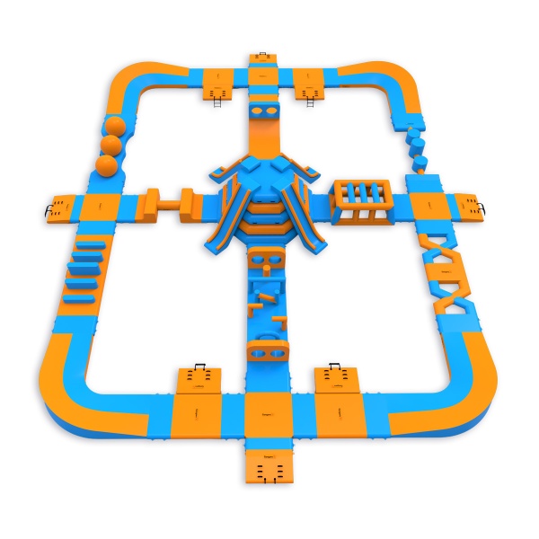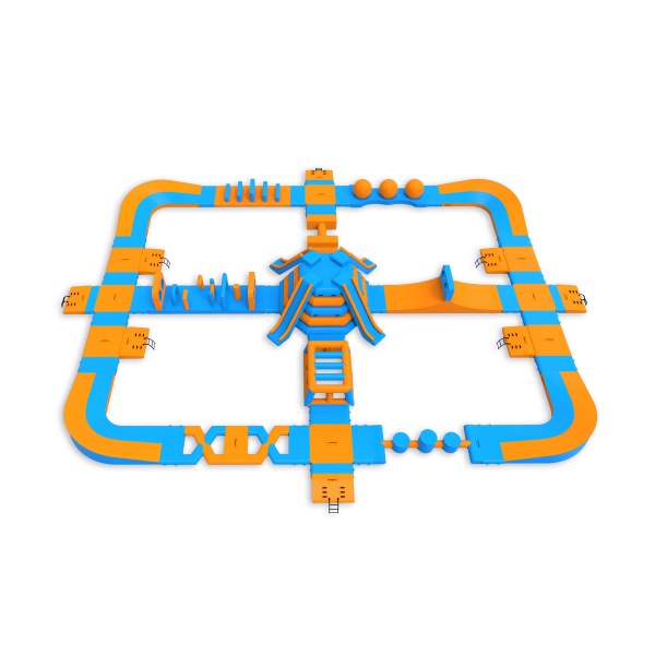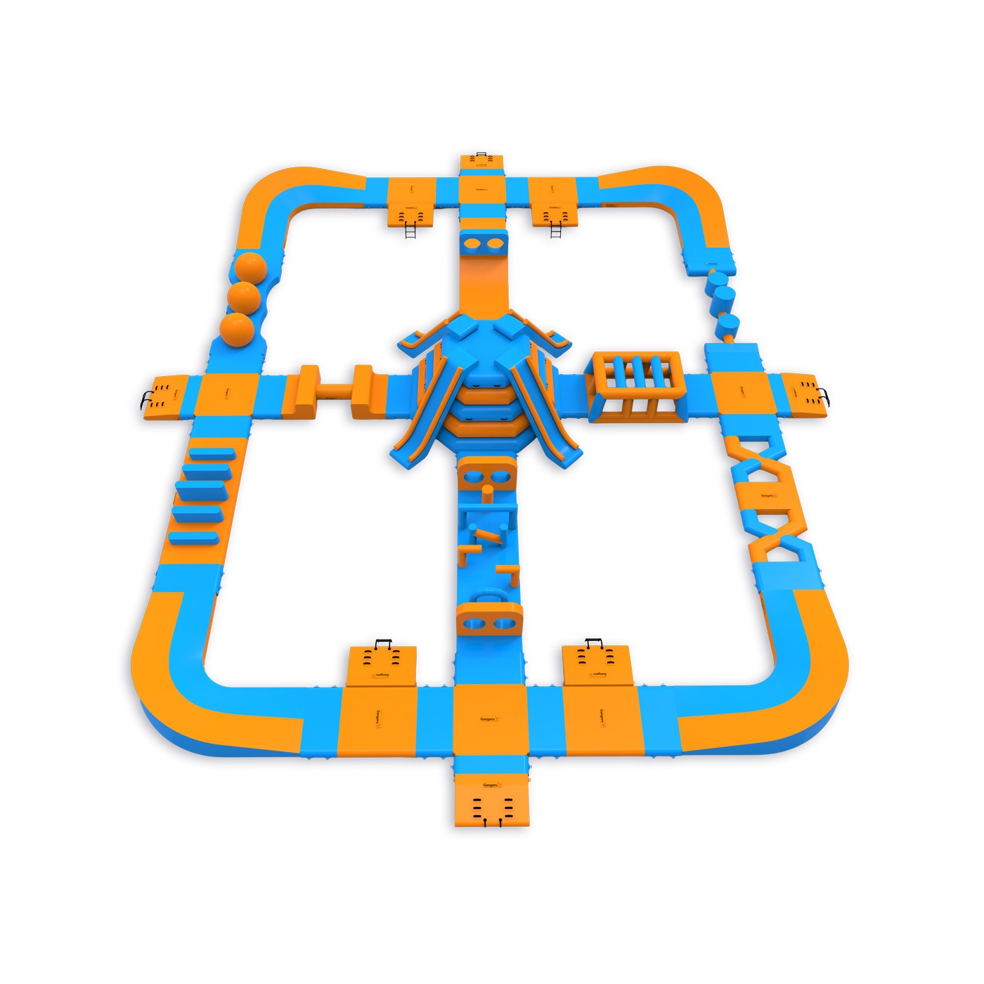 Four slides in the middle of the park - that's enough to keep participants' attention for a long time. A central tower dominates the layout, while a perimeter path with Wipeout balls, hurdles and other obstacles ensures activity for every participant - regardless of age or fitness level. Designed to accommodate 76 people at a time, it works well on medium-sized bodies of water where it is important to have attractions available for a wide cross-section of guests.