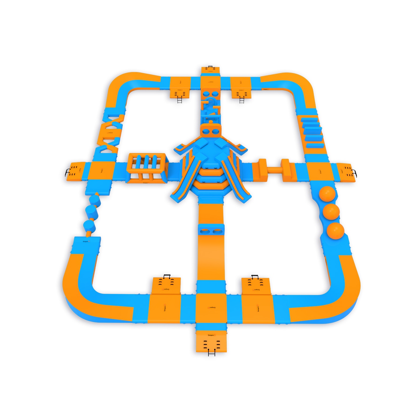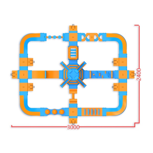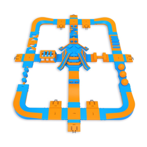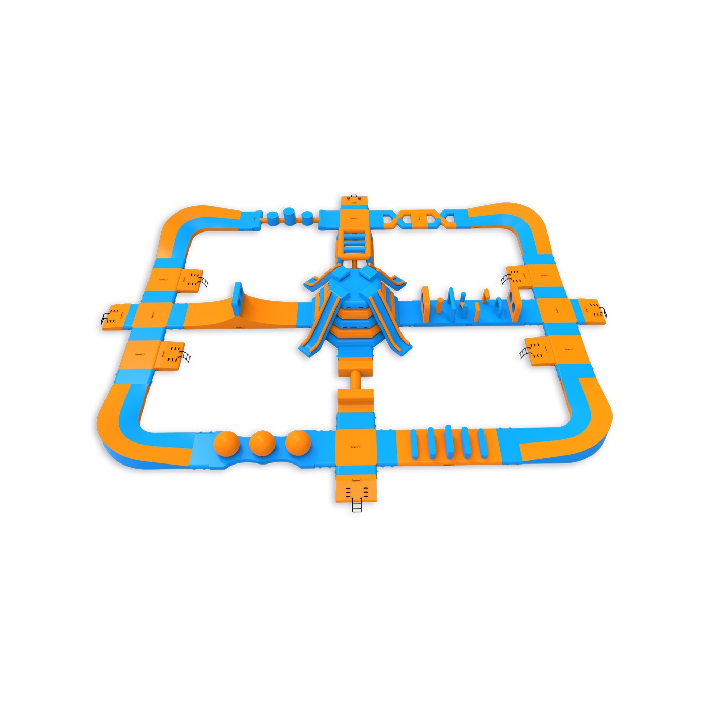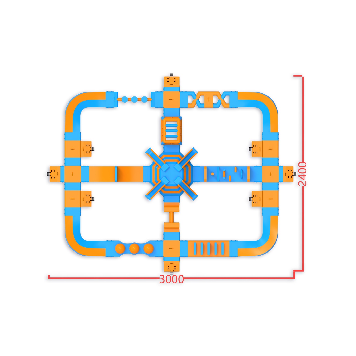 Four slides in the middle of the park - that's enough to keep participants' attention for a long time. A central tower dominates the layout, while a perimeter path with Wipeout balls, hurdles and other obstacles ensures activity for every participant - regardless of age or fitness level. Designed to accommodate 76 people at a time, it works well on medium-sized bodies of water where it is important to have attractions available for a wide cross-section of guests.