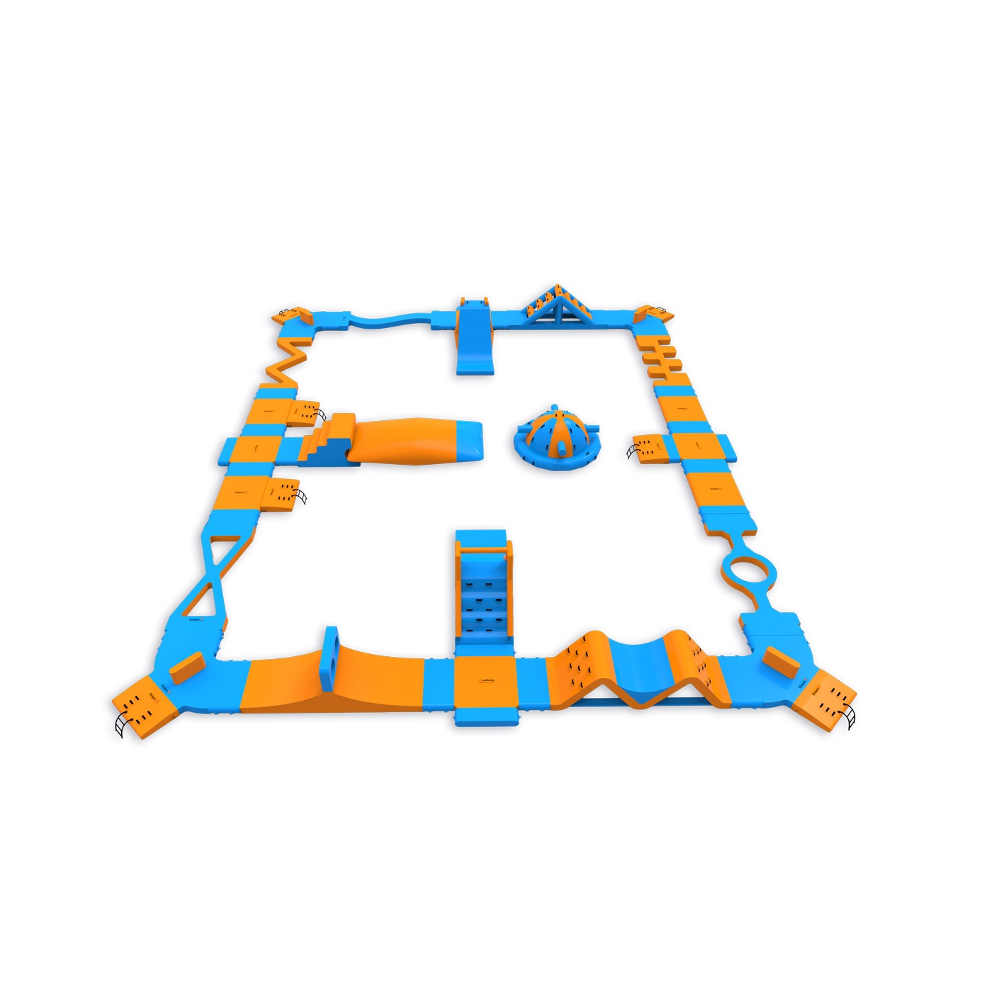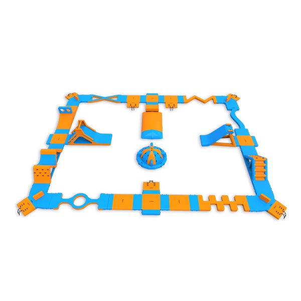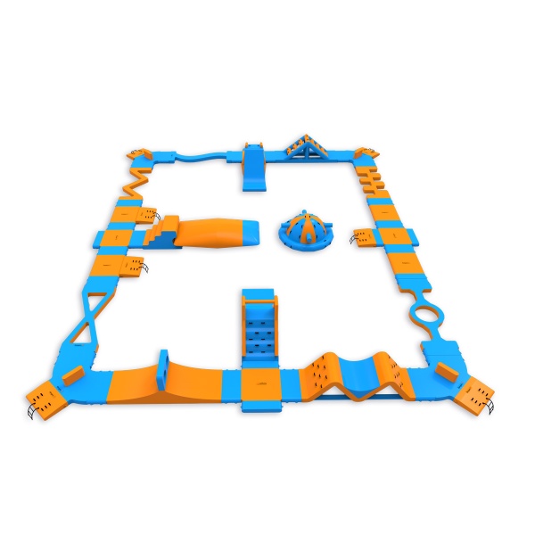 A jumping cushion in the centre of the park - a feature that attracts participants and naturally extends their time on the water. A circuitous obstacle course with two slides, a ball and climbing elements provides activity for every participant - whether they are waiting to jump or have just finished a round. Designed for 76 people at a time, it works well on medium-sized bodies of water where variety and high guest turnover are important.