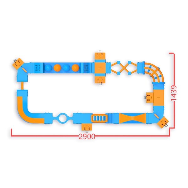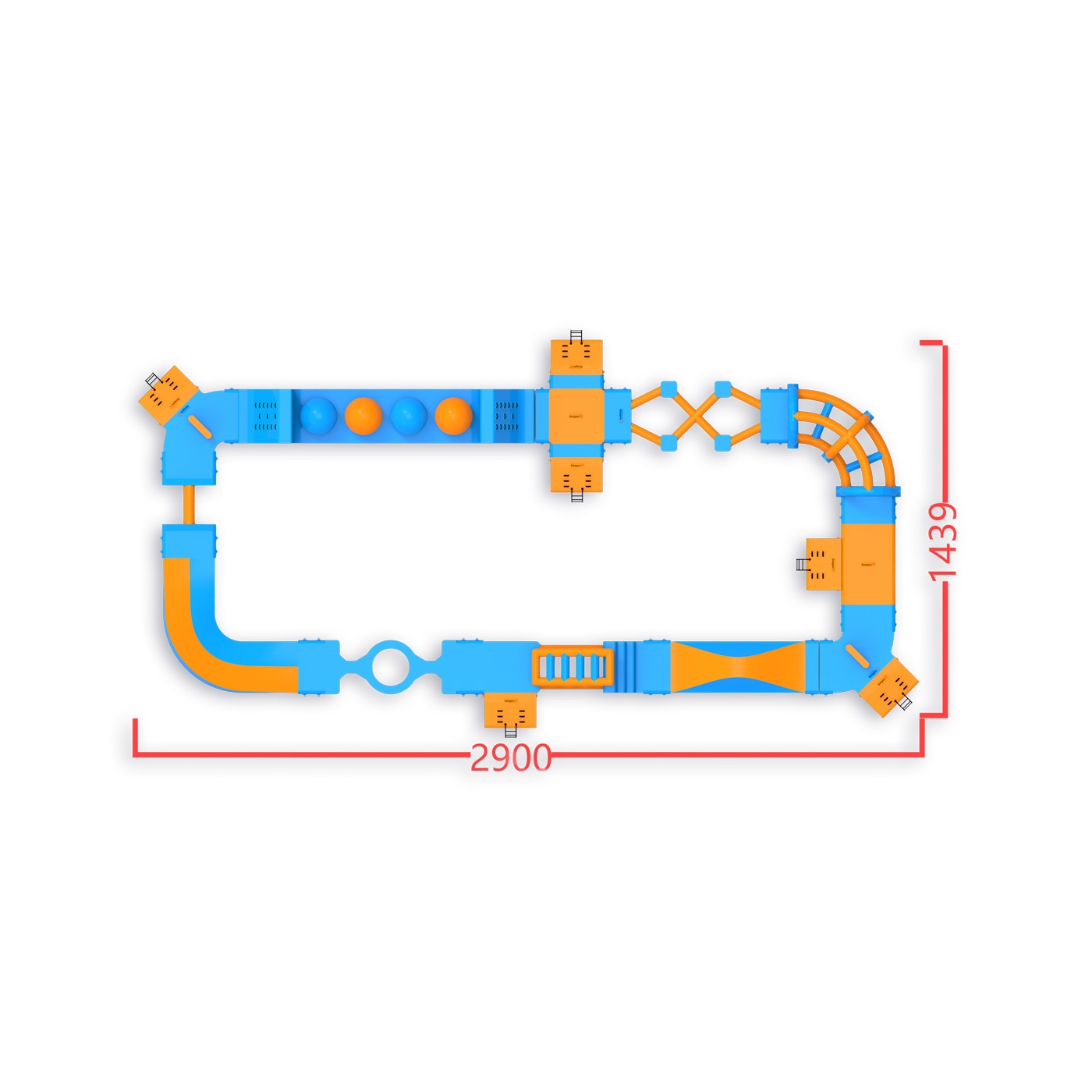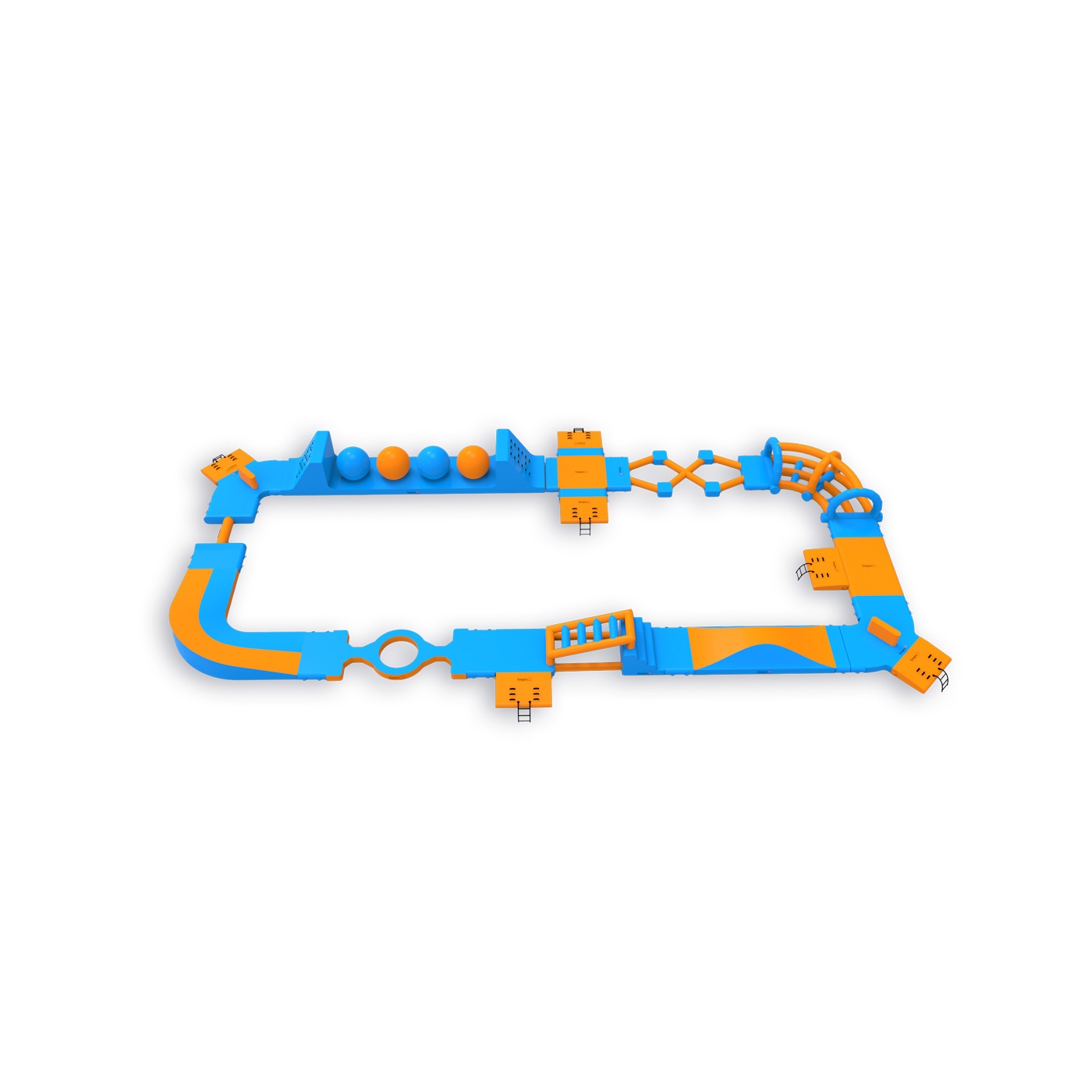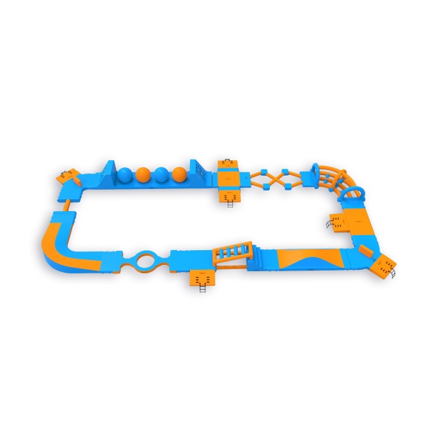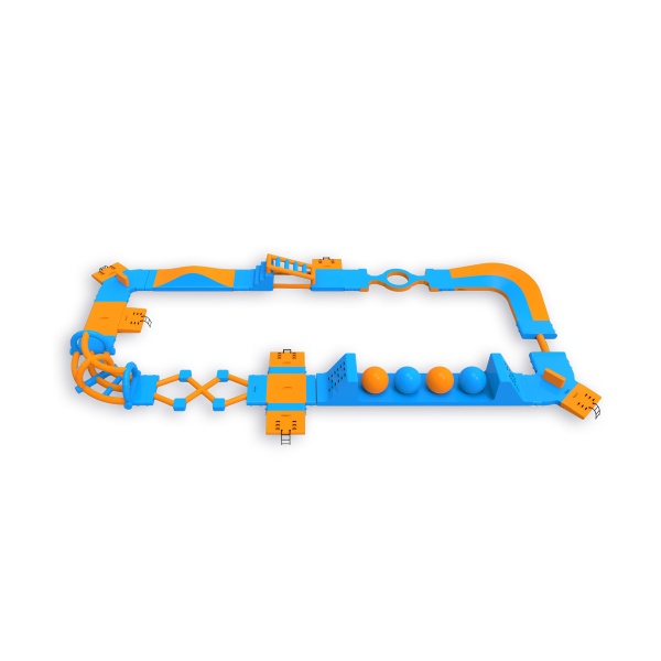Four Wipeout Balls with jumping platforms - an element that keeps participants engaged for longer and encourages further approaches. A 406 m² perimeter layout with hurdles, stairs and balance elements leads through successive activity zones, providing a natural group flow of up to 40 people at a time. It works well on medium-sized bodies of water, where it is important to have attractions available for a wide cross-section of guests and a high turnover throughout the day.